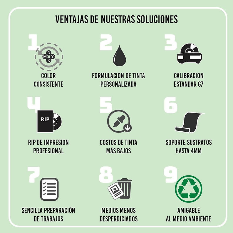 Estos equipos ofrecen una serie de ventajas competitivas, como por ejemplo: un perfil profesional personalizado que se genera al momento de la instalación, garantizando una inyección de tinta óptima al material a imprimir; tintas sin chip que reducen los costos y facilitan el mantenimiento; y un programa de ripeo perpetuo y en español que simplifica el proceso de impresión.